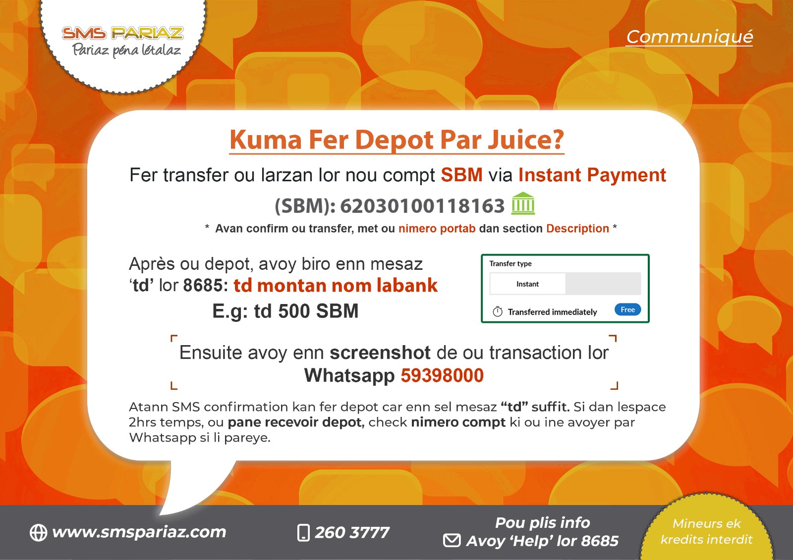 SMS Pariaz Ltd espère que ce communiqué dissipera tout doute chez le public après les récents articles parus dans la presse. SMS Pariaz Ltd insiste et confirme aussi qu'elle n'offre pas de "fixed odds bets" sur des matches de football par SMS. De ce fait, elle ne transgresse aucune loi de la République de Maurice.
